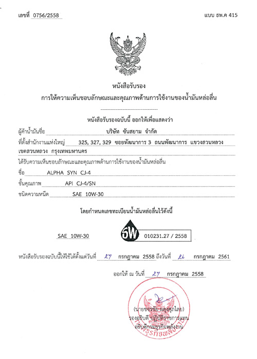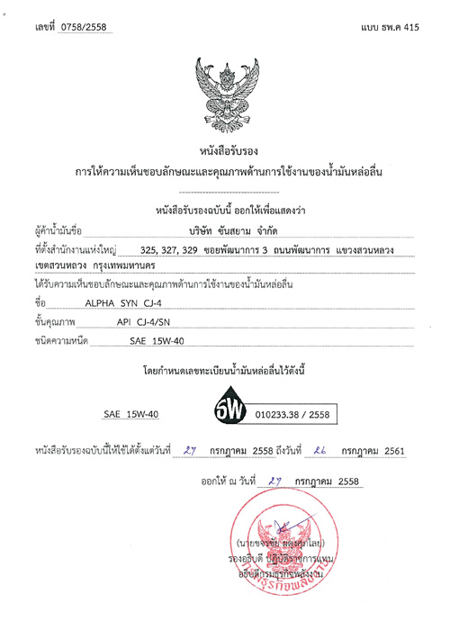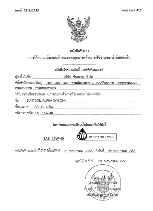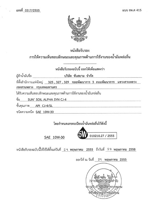 SUN'SOIL ALPHA SYN CJ-4 is suitable for all types of diesel engines including common rail system, engines with turbo charger and new engines (model-year 2007 and beyond) with Exhaust Gas Recirculation (EGR), Diesel Particulate Filters (DPF's) and Diesel Oxidation Catalysts (DOC's). It is also suitable for LPG, NGV (CNG) and gasoline engines.